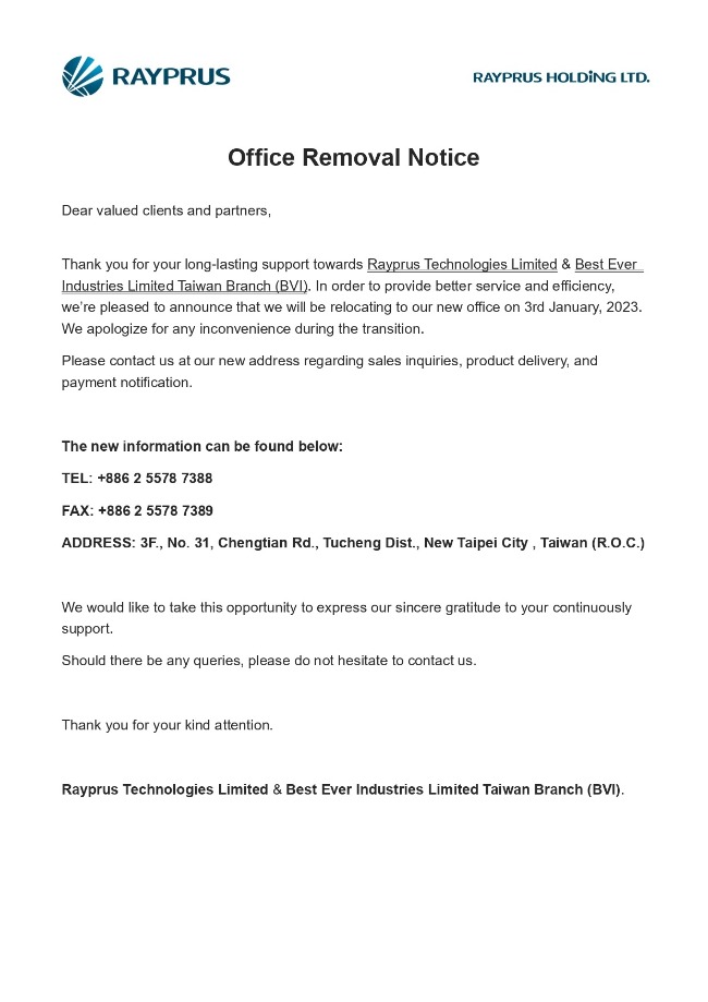 Thank you for your long-lasting support towards Rayprus Technologies Limited & Best Ever Industries Limited Taiwan Branch (BVI). In order to provide better service and efficiency, we’re pleased to announce that we will be relocating to our new office on 3rd January, 2023. We apologize for any inconvenience during the transition.Please contact us at our new address regarding sales inquiries, product delivery, and payment notification.